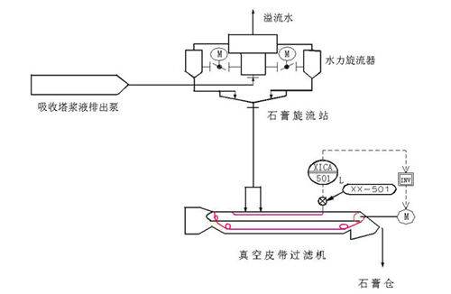 石膏是石灰石—石膏法 湿法烟气脱硫的副产物,脱硫石膏晶体的粒径为1~250μm,主要集中在30~60μm,在脱硫装置正常运行时产生的脱硫石膏颜色近白色,采用石灰石-石膏法脱硫石膏的纯度一般在90%~95%之间, WFGD中,石膏脱水系统如图所示。