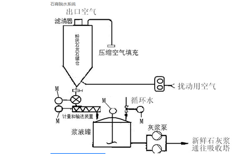 石灰石浆液制备系统主要由石灰石粉贮仓、石灰石粉计量和输送装置、带搅拌的浆液罐、浆液泵等组成,如图所示。将石灰石粉由罐车运到料仓存储,然后通过给料机、计量器和输粉机将石灰石粉送入在浆配制罐。在罐中与来自工艺过程的循环水一起配制成石灰石质量分数为15%~20%浆液。用泵将该浆液经由一带流量测量装置的循环管道打入吸收塔内。